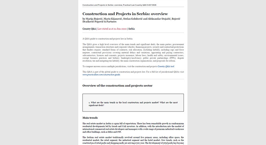 Partner Marija Bojović, senior associates Mario Kijanović and Stefan Golubović and associate Aleksandar Stojačić prepared an article about construction and projects in Serbia for the Thomson Reuters Global Guide.